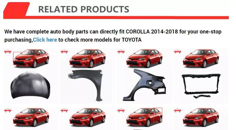 We have a wide range of car models mainly toyota,dodge,ford,JEEP,honda,kia,hyundai,renault,peugeot.etc.we know the market well as we have in auto body parts line since 1998,we can help you win the market,choose us will save time to find parts and get a reliable,helpful partner but also a long-term friend.